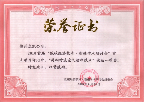 2010年9月25日,由徐州眾凱公司自主研發(fā)的“兩相對流空氣潔凈技術(shù)”在2010屆“低碳經(jīng)濟(jì)技術(shù)·新疆學(xué)術(shù)研討會”重點(diǎn)項(xiàng)目評比中榮獲一等獎(jiǎng)。