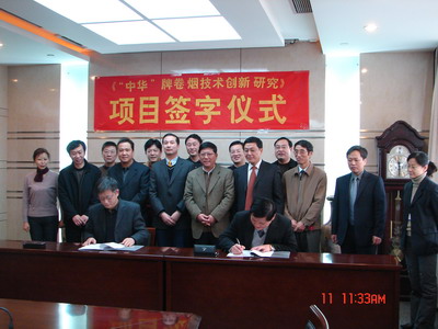 在協(xié)議書簽訂后第五天,上海煙草(集團)公司高憲法巡視員、施超副總經(jīng)理等一行五人來到鄭州院,簽訂了《“中華”牌卷煙技術(shù)創(chuàng)新研究(07年度)》技術(shù)開發(fā)合同。此合同的簽訂標(biāo)志著鄭州院與上海集團圍繞“中華”牌卷煙技術(shù)創(chuàng)新研究工作的正式啟動。