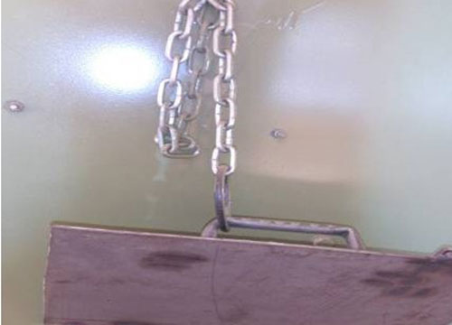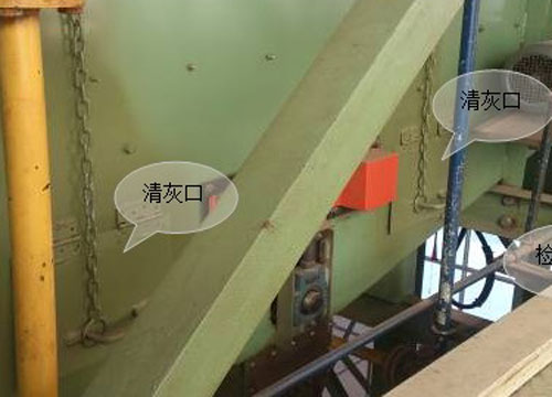 為此,生產(chǎn)加工車間通過開展QC小組活動,對預壓機雙向喂料皮帶維護保養(yǎng)難的問題進行攻關,對設備進行小的改造,在雙向輸送帶側板兩邊各自開了兩個清灰口,在清灰口上安裝了一道可以打開關閉的門,在門上安裝防止脫落的鐵鏈,鐵鏈上有一個掛鉤便于清灰時將門固定在鐵鏈上,這樣清理人員可以安全的站在檢修平臺上進行徹底的清里。見圖二。