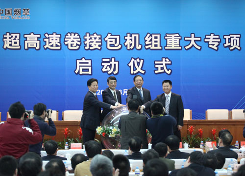 在本次會議上,還舉行了超高速卷接包機組預訂單簽字儀式和超高速卷接包機組重大專項啟動儀式。中國煙草機械集團分別與上海煙草集團有限責任公司、云南中煙工業(yè)有限責任公司等十家國產(chǎn)超高速卷接包機組的用戶單位簽署了超高速卷接包機組預訂單。國家煙草專賣局科技司司長金忠理宣讀了《國家煙草專賣局關(guān)于啟動超高速卷接包機組研制重大專項的通知》,正式啟動實施超高速卷接包機組重大專項。
