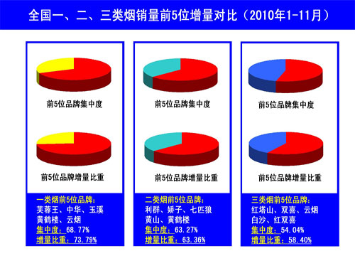 另一方面,按照經(jīng)濟(jì)學(xué)家巴萊多提出的二八定律,百分之二十的品牌或產(chǎn)品占據(jù)著百分之八十的市場份額,以現(xiàn)時(shí)全國120多個(gè)的品牌數(shù)量,占據(jù)絕大部分市場份額的將會(huì)是不到30個(gè)品牌,但實(shí)際上,留給那些百分之二十以外品牌的市場空間越來越狹窄,超過百分之八十的品牌正在搶奪不到百分之二十的市場份額。1-11月,一類煙銷量前5位品牌芙蓉王、中華、玉溪、黃鶴樓、云煙的市場集中度已經(jīng)超過68%,增量比重也已占據(jù)七成以上;二類煙銷量前5位品牌利群、嬌子、七匹狼、黃山、黃鶴樓的市場比重、增量比重雙雙超過63%;三類煙銷量前5位品牌紅塔山、雙喜、云煙、白沙、紅雙喜的市場集中度、增量比重雖然相對略低,但同樣雙雙占據(jù)半壁江山。